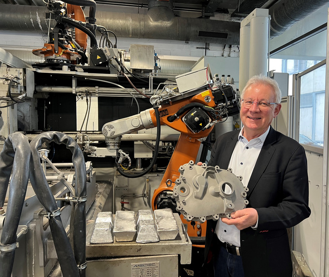Ein uraltes Handwerk, verbunden mit modernster Hochtechnologie, Robotik und Materialwissenschaft – die Gießereitechnik spielt eine Schlüsselrolle in zahlreichen Industriezweigen. Ob Elektromobilität, erneuerbare Energien oder Digitalisierung: Innovative Gusslösungen sind das Rückgrat für viele neue Technologien. Sie ermöglichen die Fertigung von Bauteilen, die extremen Belastungen standhalten oder besonders leicht und leistungsfähig sind. Prof. Dr. Lothar Kallien angelt den Motor-Gehäusedeckel eines Fiat 500 Elektro aus dem Regal. „Früher hat der drei Kilo gewogen, jetzt nur noch ein Kilo“, sagt Kallien nicht ohne Stolz. Gerade bei Elektroautos sei das Einsparen von Gewicht besonders wichtig, da die Batterien vergleichsweise schwer seien. „Leichte und dennoch stabile Bauteile aus dem Druckguss tragen dazu bei, die Reichweite und Effizienz der Fahrzeuge zu erhöhen“, erläutert der 66-Jährige. Daher steht der Druckguss mit Leichtmaterialien wie Aluminium oder Magnesium im Vordergrund der Forschungsaktivitäten, auch wenn im Gießereilabor eine breite Palette von Gusstechniken angewendet wird.